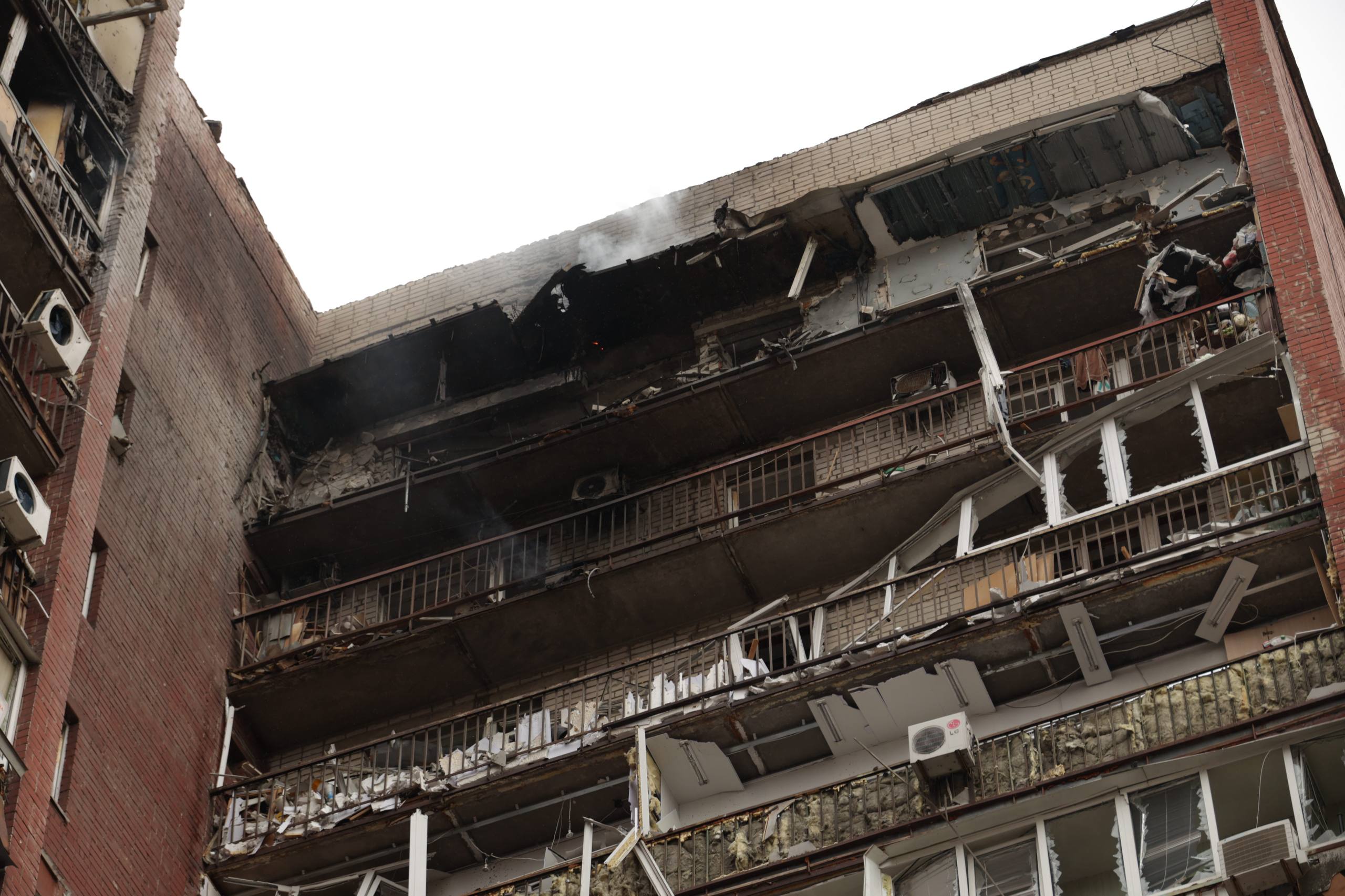 Удар спричинив суттєві руйнування 14-поверхового будинку, де пошкоджено фасадні стіни, вікна, балкони та технічний поверх. Також понівечено кілька сусідніх багатоквартирних будинків і дитячі садки.